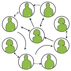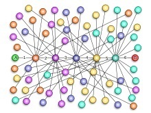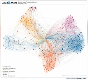 Ci-dessous les contacts du carnet d'adresses de Stephen Dale sont placés par grappe selon qu'ils se connaissent entre eux. Pour renforcer ces associations, une couleur est affectée à chaque groupe. Au sein d'un graphe social, les amas sont souvent constitués de :