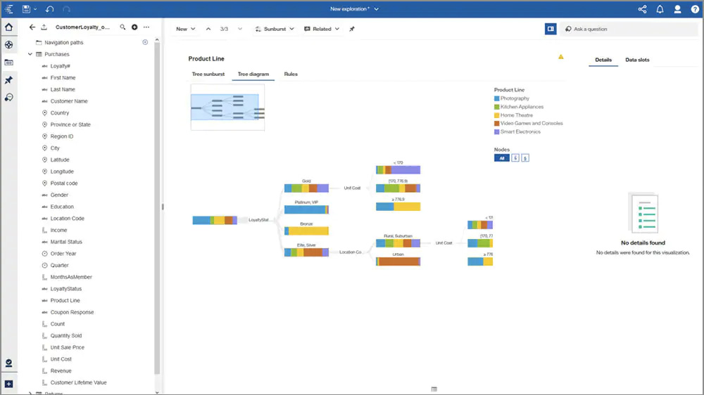 • Exploration intelligente - conçue pour aider les utilisateurs à mieux comprendre ce qui se cache derrière les résultats en analysant les données sélectionnées à l’aide du Machine Learning et de la détection de modèles;