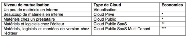 En fonction du degré de mutualisation, les bénéfices induits varient sensiblement, les choix étant faits par les utilisateurs en fonction de leurs contraintes et de leurs stratégies propres. Ainsi, le ciel du Cloud s’éclaircit lorsqu’on s’aperçoit qu’il n’existe pas un Cloud mais bien plusieurs Clouds.