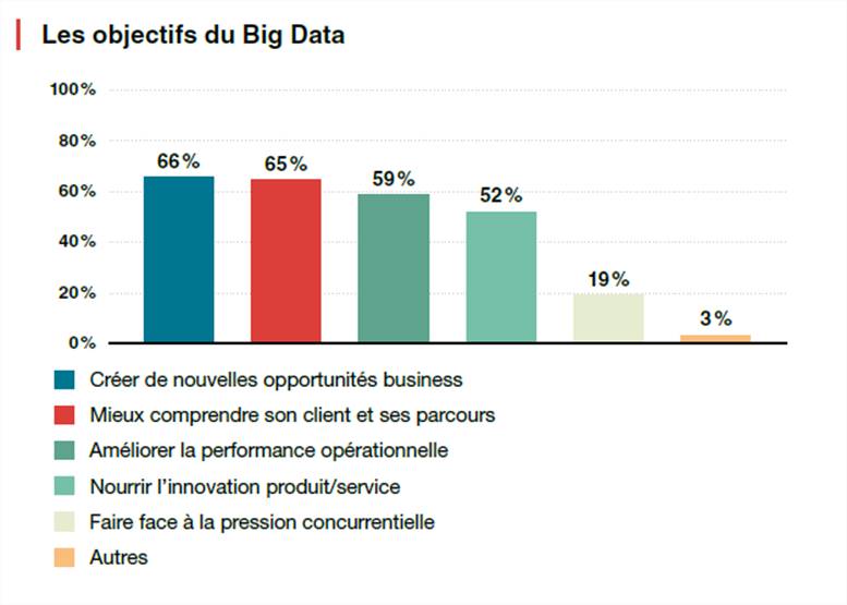 5 ans après, le Big Data n’est plus l’apanage de l’IT mais a su se frayer un chemin vers les métiers et les plus hautes strates de l’entreprise. Cela se confirme au regard des objectifs listés par les répondants : pour 66% des sondés, l’objectif des projets Big Data est la création de nouvelles opportunités Business. Une meilleure connaissance du client et ses parcours se hisse à la 2ème place, cité par 65% des répondants. L’amélioration de la performance opérationnelle, reste un objectif important et arrive en 3ème position avec 59% des réponses.