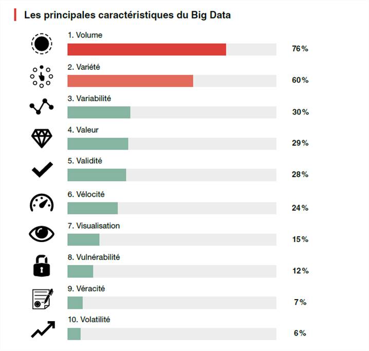 Si la définition originelle des 3V basée sur le Volume, la Variété et la Vélocité restait inchangée depuis presque vingt ans, les professionnels ont changé de vision face à l’évolution des technologies et à l’état d’avancement de leurs projets. En effet, interrogés sur les caractéristiques du Big Data, le Volume et la Variété restent en tête pour respectivement 76% et 60% des professionnels. La surprise arrive en 3ème position avec une nouvelle notion : celle de Variabilité définissant l’évolution des données dans le temps avec 30% des réponses reléguant la Vélocité à la 6ème place (24%). Les 4èmeet 5ème places sont, occupées respectivement par la Valeur et la Validité (données pertinentes à un moment donné), des notions davantage orientées business confirmant le glissement des projets vers les métiers.