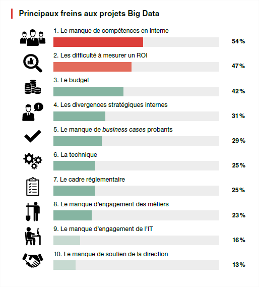 Si ces projets Big Data prennent de l’ampleur et commencent à entrer dans les mœurs de l’entreprise, pour qu’ils se concrétisent véritablement, ils nécessitent des investissements technologiques et humains. Cependant le manque de compétences en interne (à 54%) et les difficultés à mesurer le ROI (à 47%) sont les 2 freins majeurs aux projets Big Data.