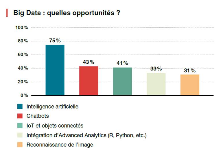 En termes d’opportunité, c’est d’abord l’Intelligence Artificielle (75%), suivie des chatbots (42,5%) puis de l’Internet des Objets (41%) qui cristallisent les attentes des professionnels. Il semblerait que ces 3 technologies soient les leviers des futurs projets Big Data pour concevoir de nouveaux services innovants.