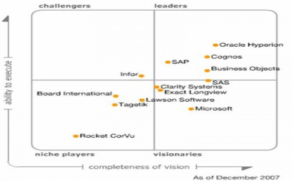 En ce début d’année, Gartner a livré la version Décembre 2008 (ci-dessous) de son carré magique concernant les solutions de CPM (Corporate Performance Management). Comme toujours c’est l’analyse différentielle d’une année sur l’autre (version 2007 ci-dessus) qui apporte le plus d’informations....