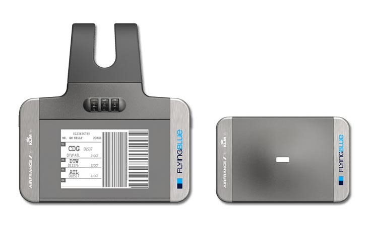 - Le eTag, une étiquette composée de deux petits écrans, que vous attachez à la poignée de votre valise. Sur ces deux écrans à encre numérique (même technologie que les liseuses électroniques) vont s’afficher l’équivalent de votre étiquette imprimée actuelle.