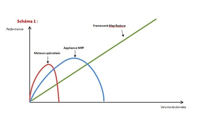 Mais voilà. Si ces deux approches répondent à des usages bien réels, elles peinent à traiter la jungle des données structurées et non structurées désormais produites : commentaires sur réseaux sociaux, mobilité, machine-to-machine, trafic web… Stratégique pour l’entreprise, cette masse croissante d’informations recèle une réelle valeur économique, mais dépasse très largement la capacité des moteurs de traitement traditionnels. Autrement dit, ces derniers ne sont déjà plus adaptés à la gestion intensive de pétaoctets de données. C’est là qu’interviennent les frameworks de type Map Reduce, dont l’approche consiste à explorer, puis à révéler des données chaudes, brutes et potentiellement non structurées. Au prix d’une moindre performance par CPU et d’une relative inertie dans les traitements, la quantité de données traitables est ici démultipliée à l’infini (cf. schéma 1), comme une motrice dont on pourrait accrocher autant de wagons qu’on le souhaite.