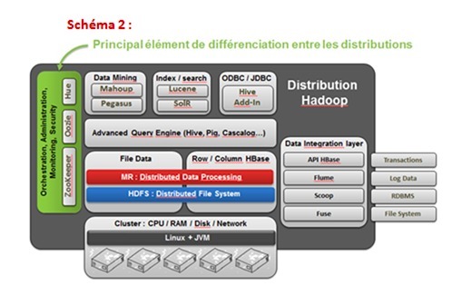 Même si Hadoop n’était peut-être pas initialement la technologie la plus performante, son environnement se développe tellement rapidement qu’aucun acteur privé ne semble en mesure d’aligner seul les ressources en R&D nécessaires pour contrer cette dynamique. Résultat, la déferlante Hadoop a étouffé toute velléité de concurrence propriétaire, devenant hégémonique en à peine 4 ans d’existence. Microsoft a même fini par troquer sa technologie propriétaire Windows HPC Server (abandonnée en novembre dernier) contre une solution « Hadoop native » sur Windows Azure, tandis que la technologie Map Reduce développé par Aster Data, racheté (trop tôt ?) par Teradata, n’a eu pas le temps de percer. A l’inverse, Amazon Web Services (AWS) a bâti son offre de Big Data sur le moteur Hadoop proposé en mode On Demand tandis que Oracle installe Cloudera au cœur de sa Big Data Appliance. Finalement, il ne reste plus aux éditeurs qu’un rôle d’assemblage de briques complémentaires (administration, monitoring, sécurité…) sommées d’interagir autour du même noyau Hadoop (cf. schéma 2), à l’instar du modèle économique d’un Red Hat dans l’univers Linux.