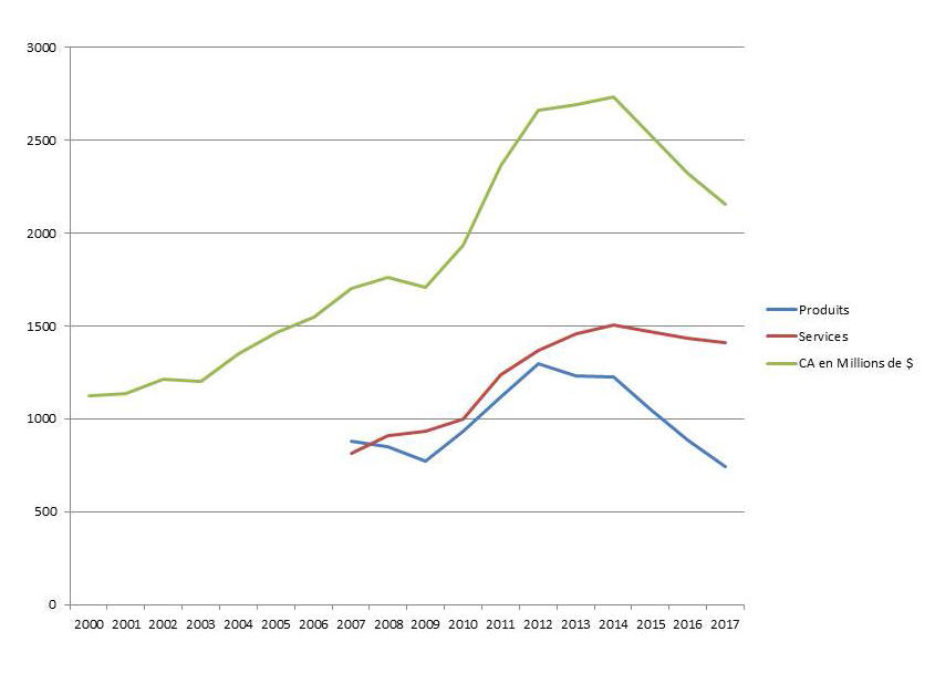 Le succès de Teradata a été fondé sur son offre de base de données qui lors de son lancement durant les années 80 était très innovante. En 2017, dans un marché en progression de plus de 10% par an ces dernières années, l'entreprise a fait un chiffre d'affaires de 2156 millions de dollars en baisse pour la troisième année consécutive (-7 à -8% chaque année). D'un point de vue global, l'historique de ses résultats, classe l'entreprise en phase avancée de maturité. D'un point de vue plus détaillé, on constate que le CA global est maintenu à un bon niveau grâce aux activités de services et qu'en fait la baisse des résultats au niveau des produits (base de données, serveurs …) est amorcée depuis 5 ans : CA produits 2012 = 1297 millions de dollars vs CA produits 2017 = 747 millions de dollars. La ligne de produits Teradata est donc peut être déjà en phase de déclin (cf. tableau du CA de Teradata ci-dessous ainsi que le dernier rapport d'activité de 2017)