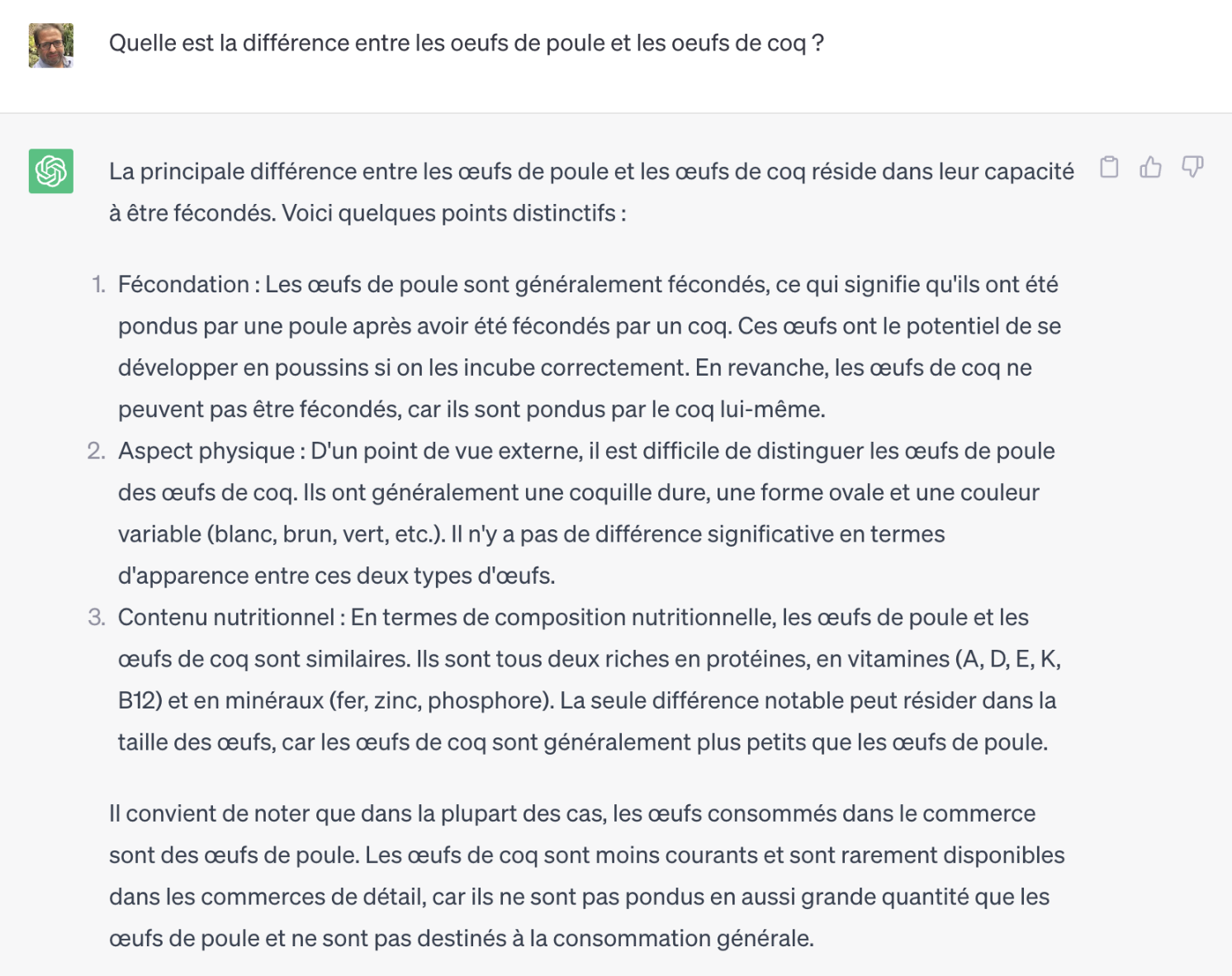Il y a juste quelques jours, je demandais à ChatGPT, devant mes stagiaires en formation, de m’expliquer les différences entre les oeufs de poule et les oeufs de coq… ce dont il s’est parfaitement acquitté, avec moultes détails sur leur mode de fécondation et leur taille (voir ci-dessus). Je reste dubitatif sur ma confiance dans l’outil pour lui confier l’explication des données décisionnelles stratégiques de mon entreprise. C’est pour l’instant un peu comme une calculatrice qui vous donnerait un résultat juste… parfois.