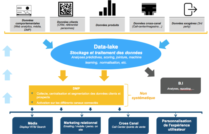 DMP et data-lake ont vocation à communiquer : le date-lake agrège et traite la donnée avant de la transformer et de la transmettre. La DMP, outil d’identification opérationnel, récupère l’intelligence et l’active sur différents canaux on et off-line.