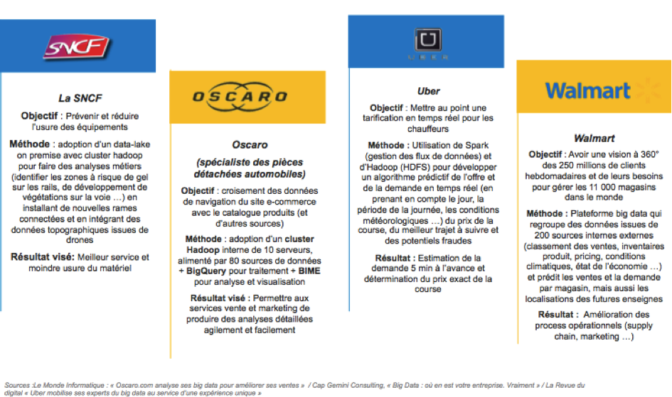 De nombreux projets big data, au sein d’une multitude de secteurs (loisirs, banques/assurances, retail ou encore transports/industrie) peuvent bénéficier de cette opportunité technologique dont les champs d’application sont très divers : expérience client, marketing media, optimisation industrielle, innovation produit/service…