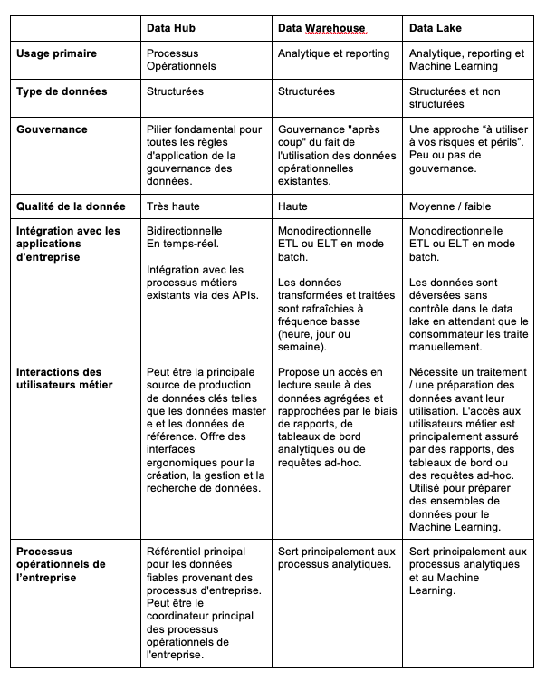Les Data Warehouses, les Data Lakes et les Data Hubs ne se substituent pas les uns aux autres. Néanmoins, ils sont complémentaires et, combinés, ils peuvent soutenir les initiatives “data-driven” et la transformation digitale des entreprises. Le tableau ci-dessous résume leurs similitudes et leurs différences :