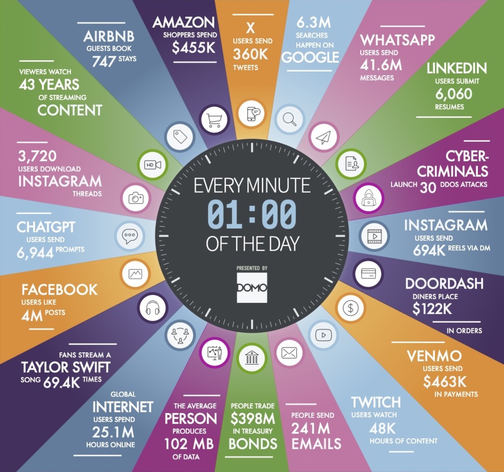 Aujourd'hui, Domo (Nasdaq : DOMO) a dévoilé sa 11e édition très attendue de “Data Never Sleeps”. Au cours de la dernière décennie, Domo a suivi l'utilisation des données dans le monde, révélant des augmentations remarquables de l'activité sur diverses plateformes en ligne, d'Instagram et X à Amazon, Venmo, et bien d'autres. L'infographie annuelle Data Never Sleeps offre un aperçu global de l'immense volume de données générées sur Internet chaque minute, montrant comment les données évoluent et changent constamment à mesure que de plus en plus de personnes interagissent avec les plateformes et les services numériques.