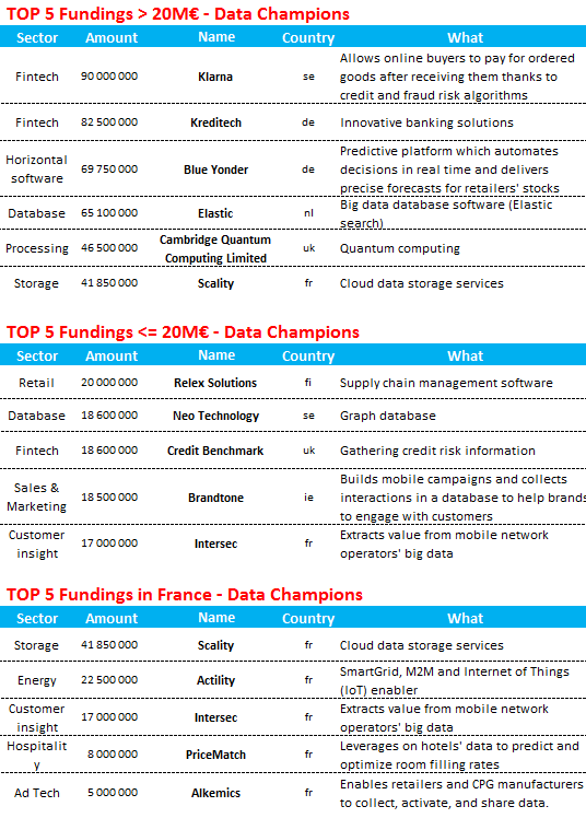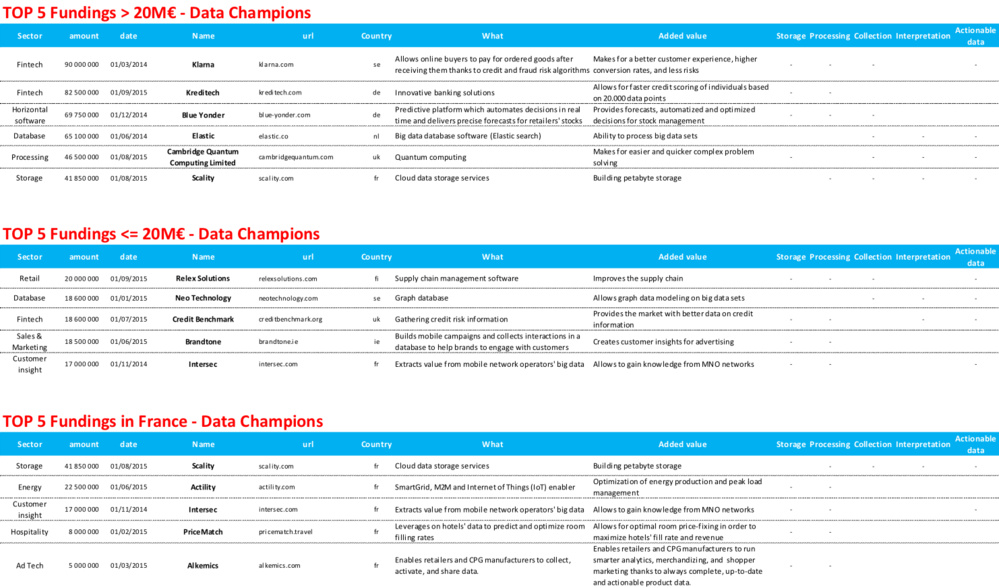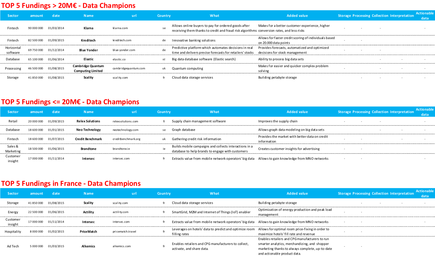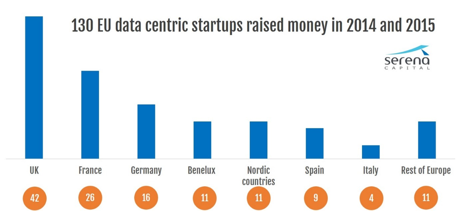 Plus de 3000 levées de fonds ont été analysées -manuellement- par l’équipe de Serena Capital qui a identifié 130 data champions en Europe : des startups dont la proposition de valeur se fonde sur une exploitation intelligente de la donnée et qui ont levé jusqu’à plusieurs dizaines de millions pour certaines. Au total, plus d’un milliard d’euros ont déjà été investis dans les startups data de l’écosystème Européen en 2014 et 2015, dont 70M€ en France qui, sur les montants investis, se classe derrière le Royaume-Uni Pre-Brexit (176M€ investis) et l’Allemagne (94M€) tout en étant deuxième en termes de nombre de startups data financées (26 entreprises). Plus de la moitié de ces levées portent sur des investissements de 1 à 5M€ et on dénombre déjà une quinzaine de tour de financement supérieurs à 20M€.