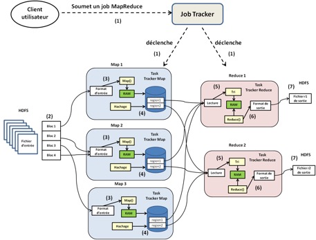 1- Au départ, l’utilisateur configure le Job MapReduce : il écrit la fonction Map, la fonction Reduce, spécifie le nombre de tâches Reduce que nous appellerons r, le format de lecture du fichier d’entrée, le format de sortie des r fichiers Reduce, éventuellement la taille des blocs du fichier d’entrée et le facteur de réplication . Une fois que tout cela est fait et qu’il déclenche l’exécution du job, le Jobtracker démarre les r tasktrackers qui vont effectuer les r tâches Reduce que l’utilisateur a spécifiées ;