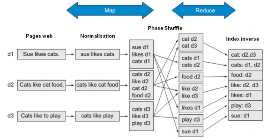 – Au niveau du traitement : Google décide de découper le problème d’indexation des pages web en sous-tâches ou sous-problèmes qui seront distribués dans le cluster pour exécution. Pour ce faire, Google décide de construire un index inversé par mot clé contenu dans chaque page web. Pour faire simple, un index inversé correspond à la page d’index d’un livre ; il est constitué des mots-clés, avec pour chaque mot clé ses différentes localisations dans tout le document. Ainsi, chaque fois que vous recherchez un mot, vous pouvez vous servir de l’index pour identifier la ou les pages où le mot que vous cherchez se situe, cela vous évite de fouiller tout le document page par page pour retrouver le mot. Aujourd’hui, la recherche Internet fonctionne selon ce principe. Le moteur de recherche constitue une base d’index inversés pour chaque mot. Cependant, construire un index inversé n’est pas aussi simple que ça en a l’air. Pour que vous ayez une image claire du problème, prenons l’exemple d’une page web contenant 5 000 mots. Le moteur de recherche doit indexer les 5 000 mots. Indexer 1 000 pages web, contenant chacune 5 000 mots, demande la construction d’un index inversé de 5 000 000 mots (1 000 × 5 000). Pour construire l’index inversé, Google passe par un raisonnement en trois phases consécutives : la première phase, appelée par Google la phase Map, consiste à assigner à chaque nœud du cluster la tâche d’attribuer à chaque mot de la page web un indice correspondant à la page dans laquelle il est. Cet indice peut être le titre de la page, le numéro de la page, bref n’importe quel élément qui permet d’identifier la page de façon unique parmi toutes les pages qui constituent tout le site web. Cette tâche s’exécute parallèlement (en même temps) dans tout le cluster. La deuxième étape, appelée par Google le Shuffle, consiste pour chaque nœud à trier par ordre alphabétique les mots auxquels il a affecté un index. Cette étape est intermédiaire et permet de faciliter le travail effectué par la troisième phase. La troisième et dernière phase, appelée par Google le Reduce, consiste pour chaque mot dans l’ensemble des nœuds du cluster, à regrouper l’ensemble de ces indices. Ainsi, on obtient l’index inversé.
