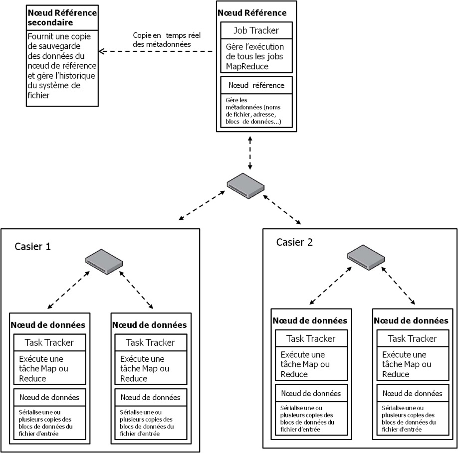 Chaque nœud possède une partie stockage et une partie traitement. La partie stockage est assurée par le nœud, tandis que la partie traitement est effectuée par le processus (Worker ou Master) qui est démarré sur le nœud. Dans la terminologie Hadoop le nom du processus est associé à la machine, on parle de Jobtracker et tasktracker.
