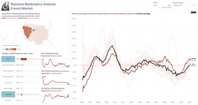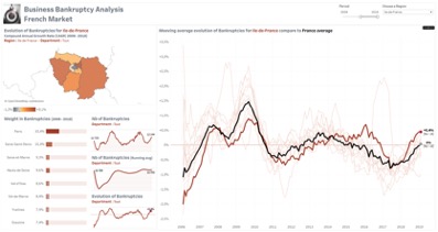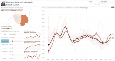 Application interactive où il est possible d’analyser le nombre de faillites d’entreprises et son évolution selon un niveau de détail Période/Région/Département.