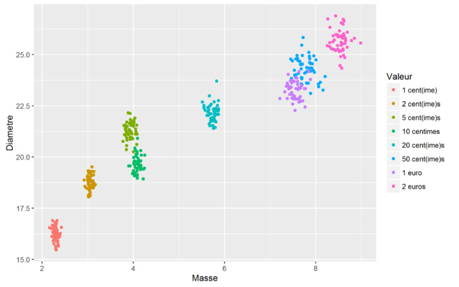 On s’aperçoit tout de suite que, si certains groupes de pièces sont facilement reconnaissables (1 centime, 20 centimes), d’autres peuvent facilement être confondus en cas de présence d’usure et si on se base uniquement sur la masse et le diamètre (par exemple, les pièces de 1 euro et de 50 centimes). Le travail de l’algorithme d’apprentissage sera de séparer ces groupes en faisant le moins d’erreurs possible. La quantité et la qualité de données, les variables utilisées (ici masse et diamètre), ou encore le choix de l’algorithme et le réglage de ses paramètres sont autant de facteurs qui vont jouer dans la précision du modèle.