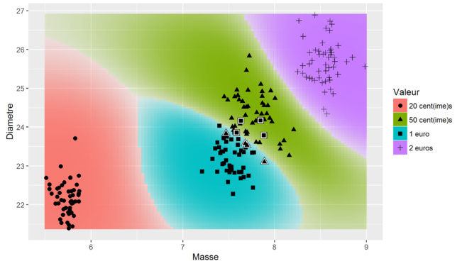 Le premier algorithme fait partie de la famille des SVM (Support Vector Machine, Figure 3). Les formes représentent les données réelles (ou données observées), et les zones de couleur marquent les limitent du classifieur. Ainsi toute nouvelle pièce qui tomberait dans la zone rouge serait considérée comme une pièce de 20 centimes. Notons que certaines formes sont entourées de blanc : ce sont des erreurs de classification. On remarque donc que ce modèle a du mal a faire la différence entre certaines pièces de 50 centimes et de 1 euro.