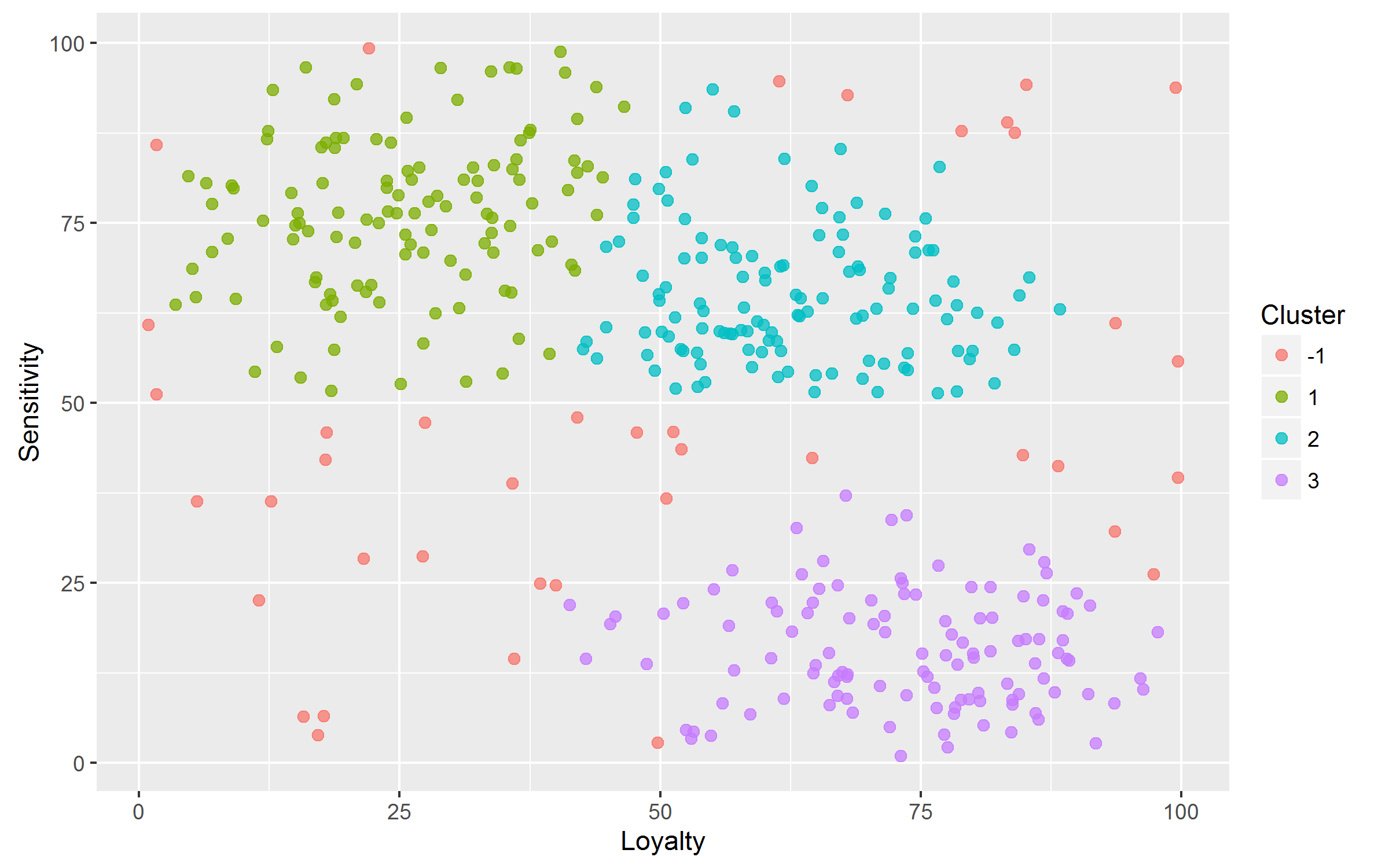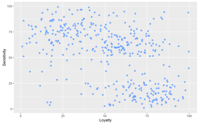 Notre programme de fidélité compte 400 clients actifs. Nous souhaitons les classer en plusieurs groupes afin d’adapter notre stratégie marketing. La Figure 5 nous permet de visualiser le comportement d’achat de nos clients selon ces deux axes d’analyse. Plus l’axe des ordonnées tend vers 100, plus le client est loyal à ses marques favorites. Plus l’axes des abscisses tend vers 100, plus le client est attentif au prix des produits.