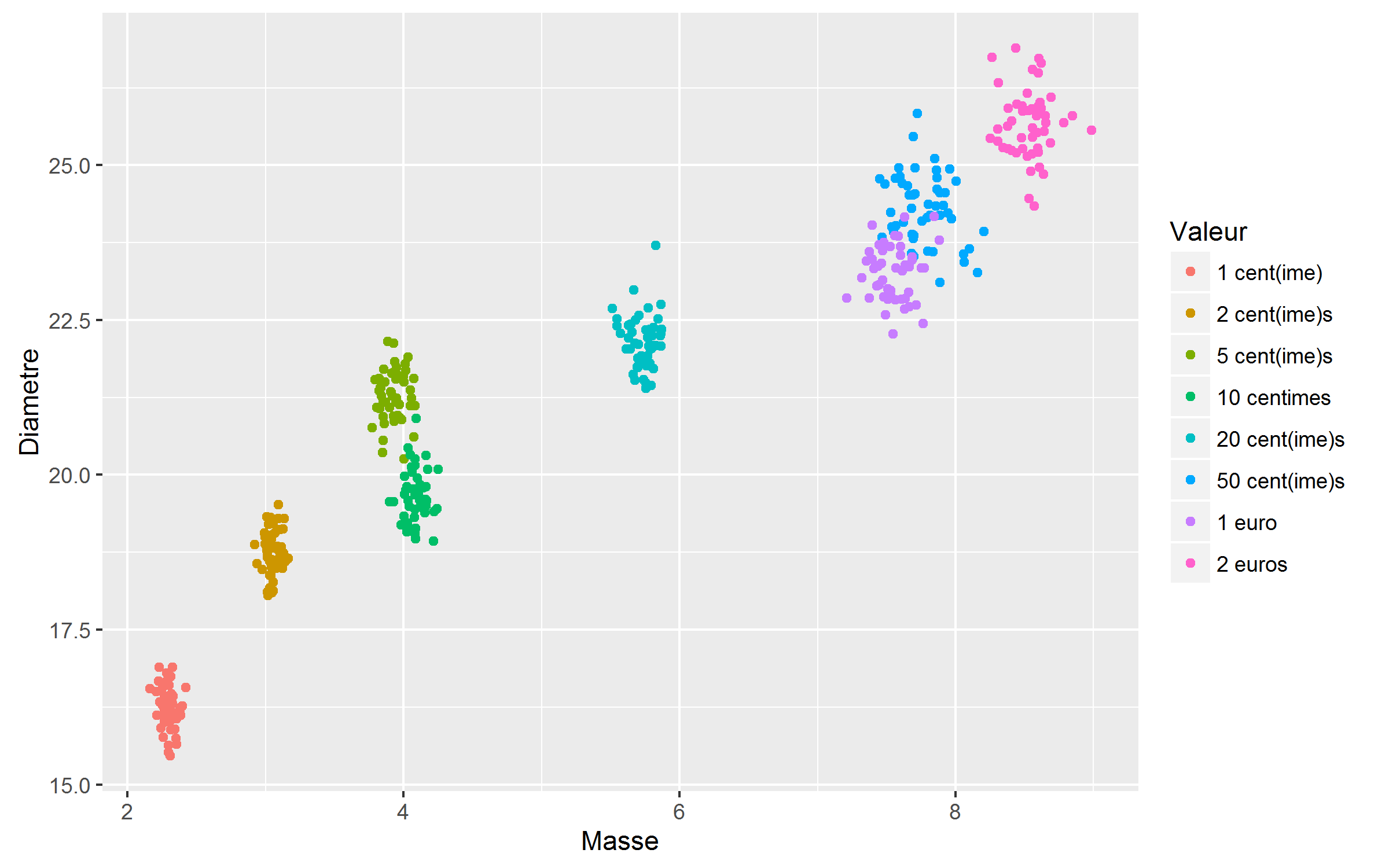 Pour illustrer la classification supervisée nous allons prendre un exemple plus simple mais facile à visualiser. Imaginons que nous souhaitons implémenter un mécanisme de reconnaissance des pièces de monnaie pour une machine à café. Celle-ci est capable de mesurer le poids et le diamètre des pièces. Lorsqu’une pièce est insérée dans la machine on souhaite créditer l’utilisateur du montant correspondant, sans se tromper. On trouve sur Wikipédia la masse et les dimensions des pièces de la monnaie européenne. Si on aspire ces données, que l’on génère un certain nombre de pièces pour chaque valeur, et que l’on y ajoute un peu de bruit pour simuler (grossièrement) l’usure, on obtient le nuage de points ci-dessous (Figure 2). En fait on peut imaginer que l’on récupère un gros sac de pièces, pour ensuite les classer par valeur et les mesurer.