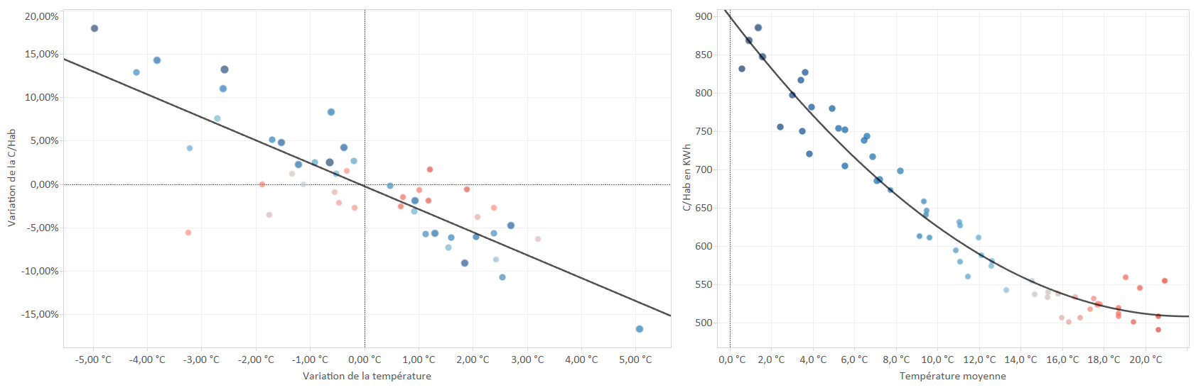Autre exemple, la Figure 1 représente deux modèles simples et faciles à visualiser exprimant une consommation électrique par habitant en fonction de la température moyenne. Le modèle est représenté par les courbes, les observations par les points.