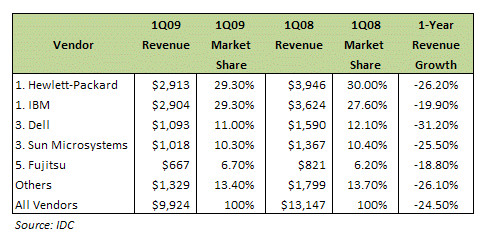 Si les DSI ont récolté les avantages d’une meilleure utilisation des ressources ainsi qu’une réduction de leurs dépenses, c’est au détriment des fournisseurs dont les ventes fondent comme neige au soleil. Tandis que décollait l’adoption de la virtualisation des serveurs, les ventes de serveurs subissaient une forte chute, passant d’un gain trimestriel régulier, tant en volume qu’en valeur, à une baisse catastrophique. En 2009, alors que la récession battait son plein (qui en soi accélère la virtualisation en raison des baisses de coûts qu’elle induit), les analystes du cabinet IDC signalaient les premières baisses de ventes des serveurs. Tous les grands noms du marché — HP, IBM, Dell, Sun Microsystems (maintenant Oracle) et Fujitsu — ont accusé un énorme recul de leurs ventes — entre 18,8 et 31,2 % en une année. Le choc a été moins fort pour dans les segments CISC et RISC haute puissance où il est plus difficile de changer de fournisseur (c’est le cas, par exemple, des applications Oracle où le coût des licences est lié au nombre de processeurs utilisés ou à un matériel spécifique) ; en revanche, l’impact a été particulièrement sensible sur le marché des produits x86 d’entrée de gamme.
