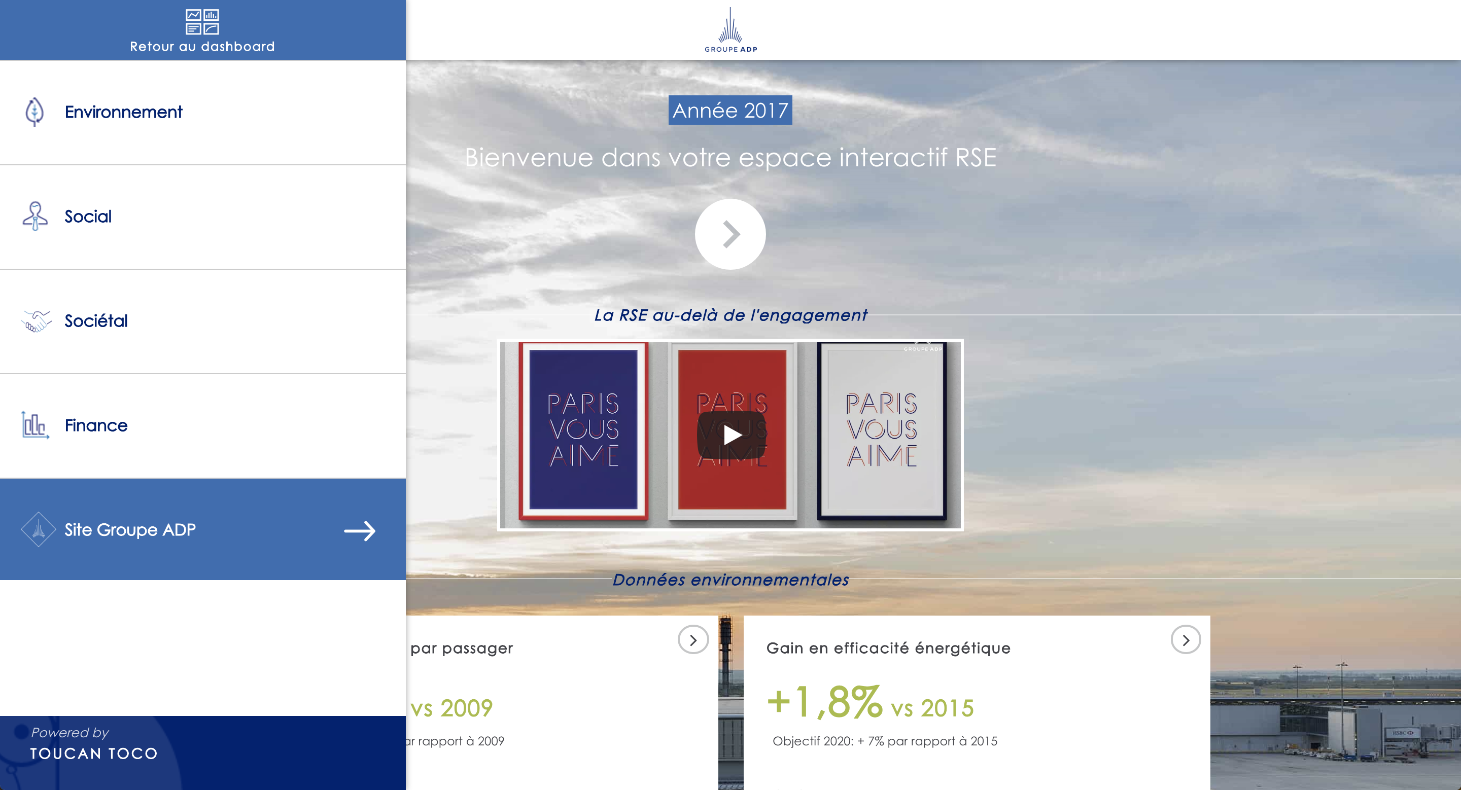 Pour répondre à cet enjeu, Toucan Toco a proposé une solution innovante qui s'appuie sur l'interactivité et la richesse de la data visualisation, permettant de restituer de façon pédagogique, ergonomique et interactive les principaux indicateurs sociaux, sociétaux, financiers et environnementaux du Groupe ADP.