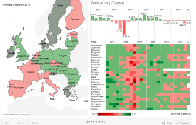 La photographie de l'Europe en récession est un exemple éloquent de ce que les données permettent de créer sur le plan journalistique. Nous savons que cela n'est en rien nouveau, mais comment dès lors proposer des articles innovants sur les chiffres trimestriels publiés par les agences européennes de statistiques ? Ces chiffres nous concernent tous, mais nous n'aimons pas tous lire de longs articles. Il serait préférable de consulter un instantané, qui donne une perspective générale de la situation, ce que proposent notamment les cartes et cartes de chaleur. Ces cartes présentent la situation actuelle et donnent une vision chronologique des événements, pour mieux permettre de déterminer à quel moment les choses ont mal tourné. De plus, les événements sont plus faciles à mémoriser dès lors qu'ils sont présentés visuellement.