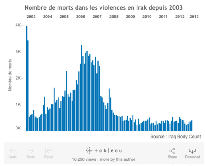 En 2013 une vague d'attentats terroristes a frappé l'Irak, et les journalistes ont réfléchi à une manière de rendre les données plus attractives et de présenter les faits de façon à pouvoir facilement déterminer le nombre de victimes depuis le début du conflit. C'est là tout l'intérêt des graphiques à barres : ils permettent de présenter la réalité des événements de manière attrayante, tout en rappelant le contexte dans lequel ils se déroulent. En lisant un article, nous pouvons facilement oublier des dates, des noms de lieux ou des citations, mais il est plus facile de mémoriser des éléments visuels, comme les pics et les creux d'une tendance sur 10 ans de conflit.