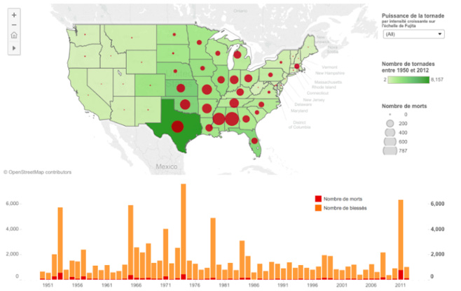 Dernier événement, mais non des moindres : la tornade en Oklahoma à la fin du mois de mai. Etant donné que les médias se devaient de couvrir un événement aussi tragique il était nécessaire de trouver un moyen simple et efficace de présenter un reportage sur un drame qui n'était peut-être pas aussi parlant au lectorat français qu'un événement local. Les tornades sont rares en France et en Europe, et ne recouvrent probablement pas la même réalité que pour le lectorat américain. C'est une vision globale qui a été choisie dans ce cas, pour permettre aux lecteurs de replacer cet événement particulier dans son contexte.