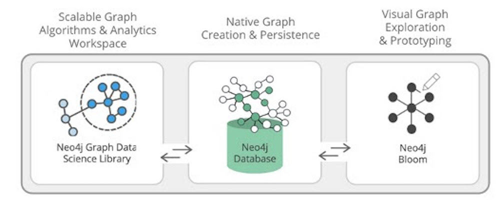 Neo4j pour la Science des données de Graphes combine trois domaines fonctionnels clés. Des algorithmes et des analyses de graphes souples et évolutifs, une base de données de graphes native et la visualisation de graphes pour la compréhension et l'exploration.