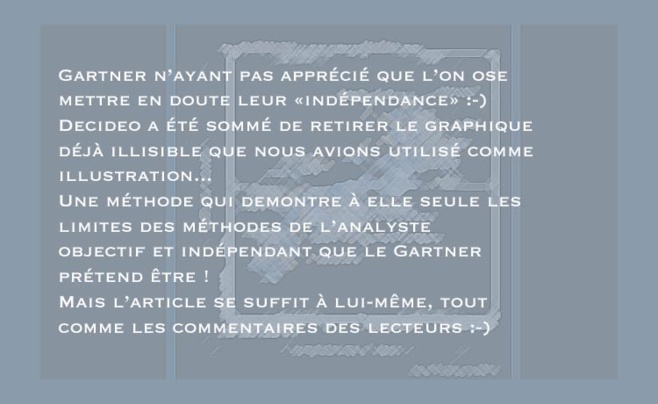 Et n’allez pas interpréter mon billet comme une critique sans recul du travail des analystes de Gartner. Mais plutôt comme une critique de l’usage que l’on en fait, sans lire en détails les commentaires fort intéressants qui accompagnent le graphique. Ne vous contentez pas d’un rapide coup d’œil sur le carré qui n’a rien de magique, allez en profondeur, et vous constaterez que chacun a ses points forts, mais aussi de très gros points faibles.