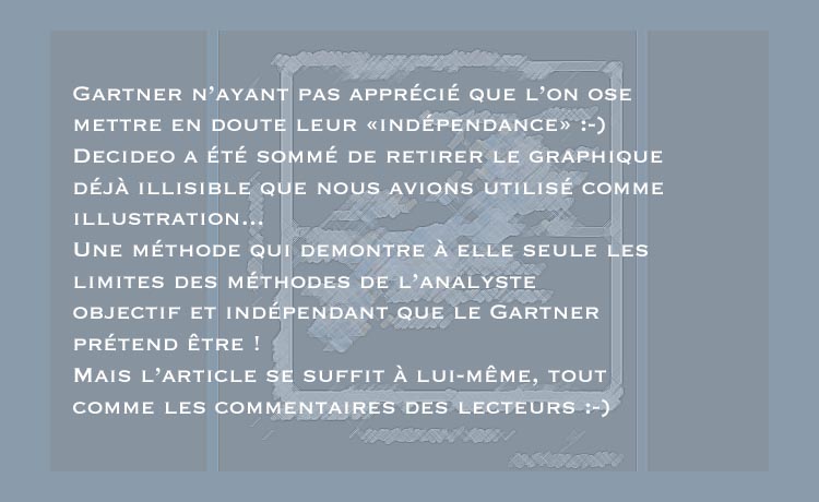 Sachant que pour être expertisé, il faut s’acquitter d’une somme rondelette et récurrente, sous forme d’un abonnement annuel, on comprend l’intérêt pour le Gartner de positionner les petits nouveaux tout en bas de l’échiquier, pour leur permettre de progresser un peu chaque année, justifiant ainsi le renouvellement de leur taxe…