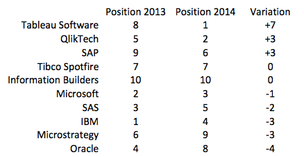En comparant l’évolution des positions d’une année sur l’autre, on constate que certains gagnent des places (Tableau Software, QlikTech et SAP) et que d’autres en perdent (Microsoft, SAS, IBM, Microstrategy et Oracle).