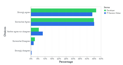 Nous retrouvons la même tendance en ce qui concerne les listes de technologies approuvées. Conclusion surprenante à nos yeux une nouvelle fois : dans l’ensemble, aussi bien les développeurs que les décideurs informatiques estiment que les listes de technologies approuvées sont utiles (figure 1). Cela reflète selon moi la diversification croissante et la rapidité accrue de mise à jour de ces listes de technologies approuvées.