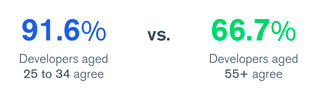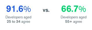 Penchons-nous sur cette tendance : 93 % des développeurs de 25 à 44 ans pensent que les décideurs informatiques et les développeurs sont d’avis convergents sur les décisions stratégiques. Ce pourcentage chute à 62 % pour les 55 ans et plus.