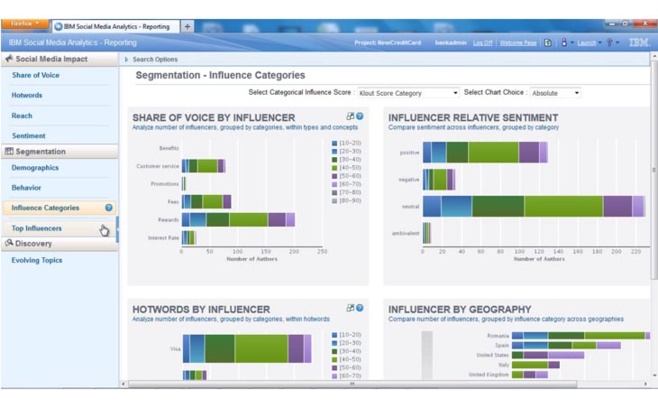 La plate-forme IBM Social Media Analytics s’appuie notamment sur le score Klout des membres des réseaux sociaux pour identifier les influenceurs clés de l’entreprise.