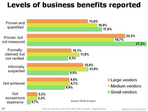 « Rien de positif en ne peut être attendu aujourd’hui de ces grands fournisseurs de logiciels en matière de Business Intelligence », explique-t-il. « Ils sont tout simplement trop occupés avec l’intégration des logiciels qu’ils ont achetés ces dernières années ». Nigel Pendse conseille donc aux utilisateurs en entreprise de choisir les meilleurs produits disponibles sur le marché c’est-à-dire généralement ceux qui sont proposés par de plus petites sociétés.