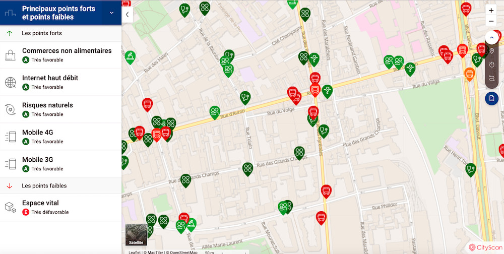 La plateforme de données, développée par la start-up CityScan, permet au futur acquéreur d’accéder gratuitement à l’évaluation de l’emplacement de son bien sur 3 nouveaux critères déterminants que sont : l’accès au développement durable (présence de bornes de recharges électriques, vélo ou auto partage…), la qualité numérique (4G, fibre à venir …) et l’accès aux loisirs (théâtre, cinéma, sport).