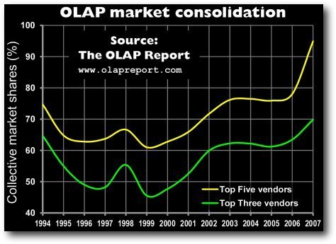 Une complexité qui interdit à Nigel Pendse de publier des chiffres de parts de marché pour 2007, tant les résultats en sont incertains. Mais la mise à jour des chiffres 2006 en tenant compte des consolidations de 2007 est intéressante. Elle montre que le podium des principaux acteurs est : Microsoft (31,6 % de PDM), Oracle + Hyperion (21,7 %), SAP + BO + Cartesis + Outlooksoft (17,8 %), IBM + Cognos + Applix (16,6 %), Microstrategy (7,3 %).