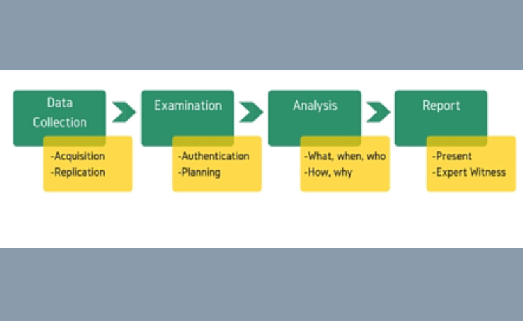 Le Computer Forensics, étape suivante de la procédure, permet l’application des techniques les plus récentes pour recueillir et préserver les preuves provenant des unités informatiques afin qu’elles soient recevables en justice. Cette procédure peut être considérablement simplifiée si les outils appropriés pour évaluer la situation ont été préconfigurés avec des scénarii permettant de traiter efficacement de tels cas. C’est évidemment nécessaire si l’on considère que les cyber-crimes sont beaucoup plus nombreux et plus fréquents que les crimes physiques, et que leurs principales victimes sont les entreprises. Le schéma du Computer Forensics comporte quatre étapes : collecte des données, examen, analyse et rapport. Avec à chaque étape une méthode permettant la recevabilité des preuves au final.