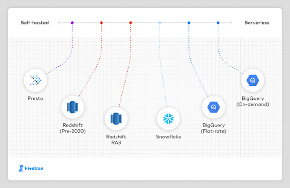 Chaque data warehouse offre une expérience utilisateur et un modèle de tarification spécifiques. Les solutions testées peuvent être réparties sur le spectre ci-dessus, de ‘Self hosted’ (auto hébergé) à ‘Serverless’.