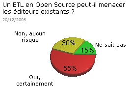A la question « un outil d’intégration de données (ETL) en open source peut-il menacer les éditeurs existants ? », vous répondez à 55 % positivement ! Seuls 30 % des sondés pensent qu’il n’y a aucun risque en revanche. Encore faudrait-il extraire de ces votes les salariés des éditeurs de logiciels concernés, qui ont certainement agi pour éviter que l’open source n’apparaisse trop visible. Pour 15 % des répondants, le sujet reste encore cependant un mystère, et ils n’évaluent pas bien la marge de progression dont disposent les projets open source sur des marchés aussi pointus que l’intégration de données.