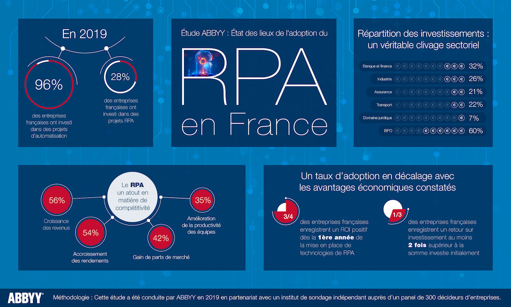 Selon une étude réalisée par ABBYY, le spécialiste de solutions d'intelligence digitale, 96 % des entreprises françaises ont investi dans des projets d'automatisation en 2019. Les systèmes automatisés et l'intelligence artificielle sont les technologies d'automatisation les plus populaires. Pourtant, seulement 28 % des entreprises françaises déclarent avoir investi dans le RPA, qui est pourtant essentiel pour tirer parti des technologies d'automatisation susmentionnées.