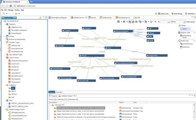 ● La modélisation logique multi-domaines, supportant les entités, relations, types de données complexes, l’héritage, la sécurité au niveau des attributs et l’internationalisation. Cette modélisation s’effectue dans une interface graphique Web 2.0