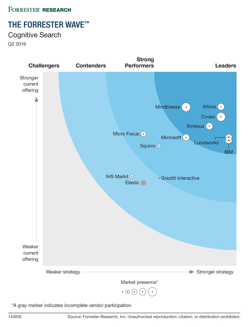 (1) Forrester Research, Inc, "The Forrester Wave™: Cognitive Search, Q2 2019" par Mike Gualtieri, avec Srividya Sridharan et Elizabeth Hoberman.