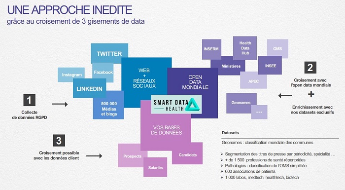Contrairement à ses concurrents, qui recueillent des millions de sources, Smart Data Health n’a volontairement sélectionné que 500 000 sources qualifiées et vérifiées. Tous les flux d’informations sont croisés avec les biographies de leurs auteurs pour mieux cerner leurs spécialités, affinités, objectifs…
