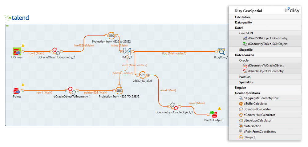 Pour les autorités publiques et les entreprises des secteurs du transport, du trafic/logistique, de la construction routière ou encore de l'industrie pétrolière, des possibilités totalement nouvelles de gestion des données s'ouvrent tout en conservant le référencement habituel : Les pipelines de données de toute source peuvent être créés, gérés, transformés, partagés et traités sur la plate-forme de données unifiée Talend, qui intègre tous les types de données de manière complète et fiable tout en assurant des performances optimales. Le plug-in développé par Disy s'intègre de manière transparente dans la palette d’outils Talend et l'enrichit de fonctionnalités géographiques.